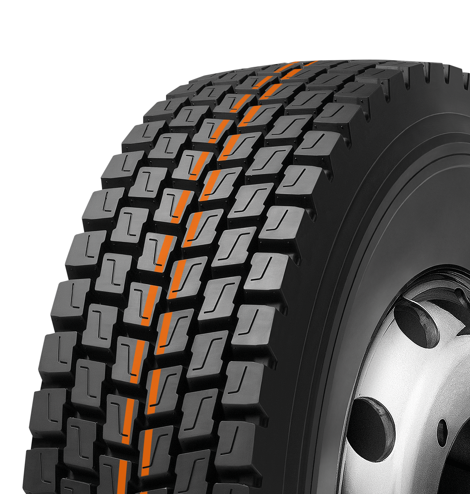 Banda para uso em pneus radiais montados em eixos de tração no transporte rodoviário de médias e longas distância. Ótima opção de desenho de tração com desempenho elevado de alto rendimento quilométrico, CPK.